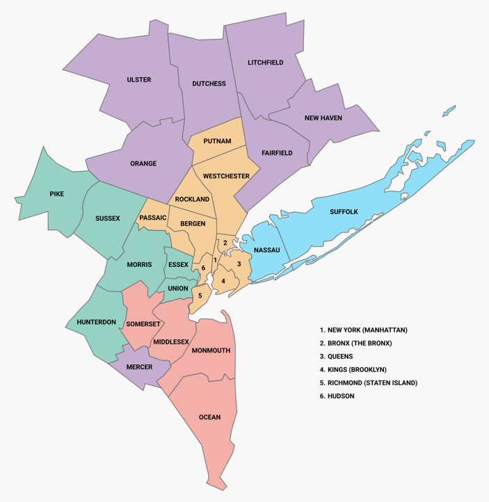 Our service area spans the entire New York City metropolitan region, covering all five boroughs, Long Island, northern and central New Jersey, and southern Connecticut and New York State counties.